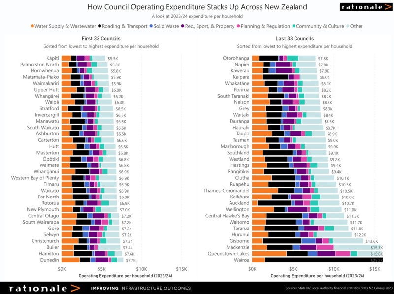 It is important to note that the measures below don’t directly reflect the rates residents pay, and don’t account for non-rate council revenue, including government funding. As always, the devil is in the detail. Some councils have received grants from government to help with recovery, roading and other activities. Others receive considerable amount of rates from utility providers and non-resident ratepayers, such as local power generators, which significantly offsets the cost per ratepayer – but isn’t shown in the data provided.