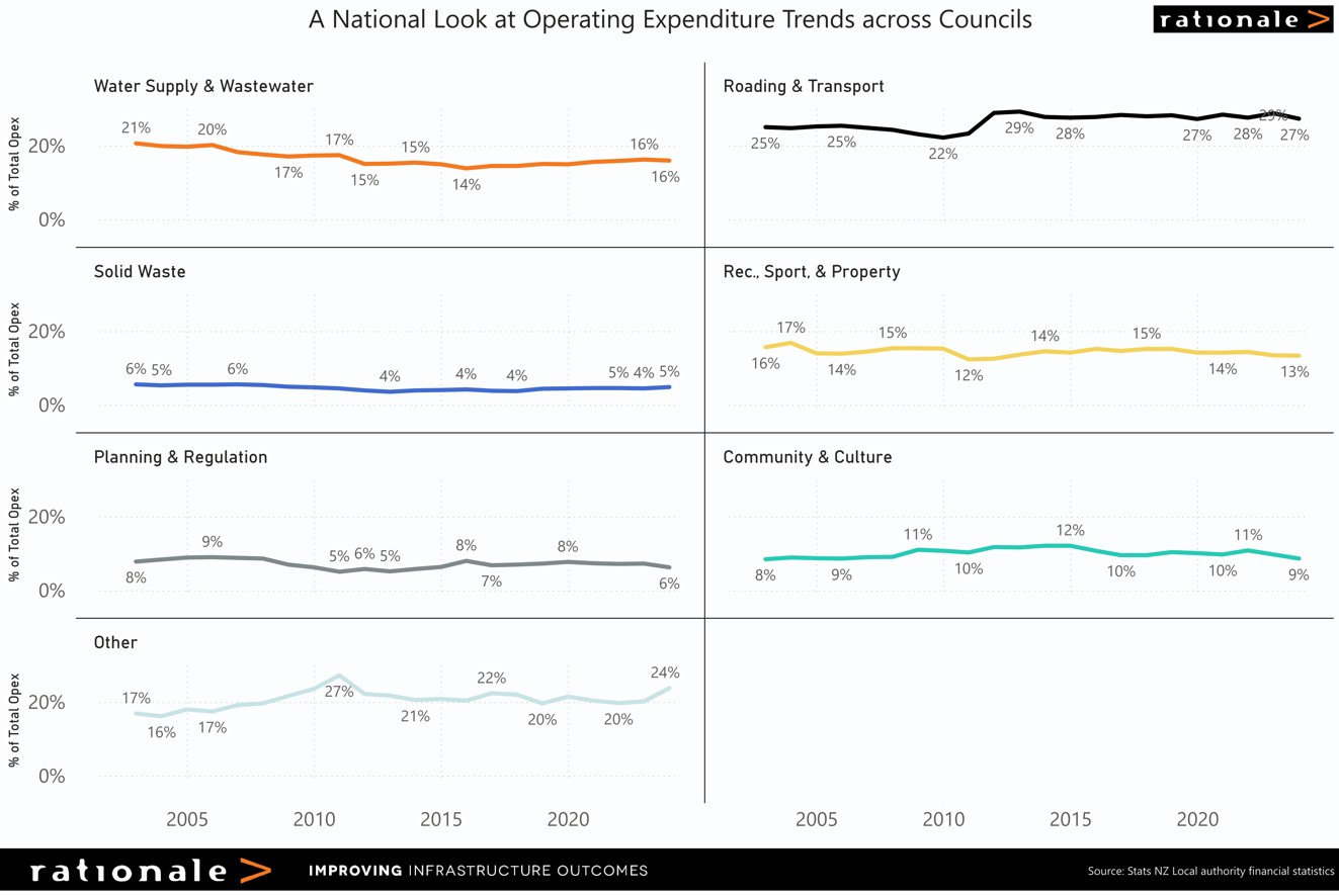 Unsurprisingly (at least to us), core infrastructure dominates council opex, with 48% going towards Water Supply & Wastewater, Roading & Transport, and Solid Waste. These are fundamental services that underpin how a district functions. Spending on them has been stable for nearly two decades, which suggests councils aren’t spending funds to ‘vanity projects’, but focusing on maintaining the basics.