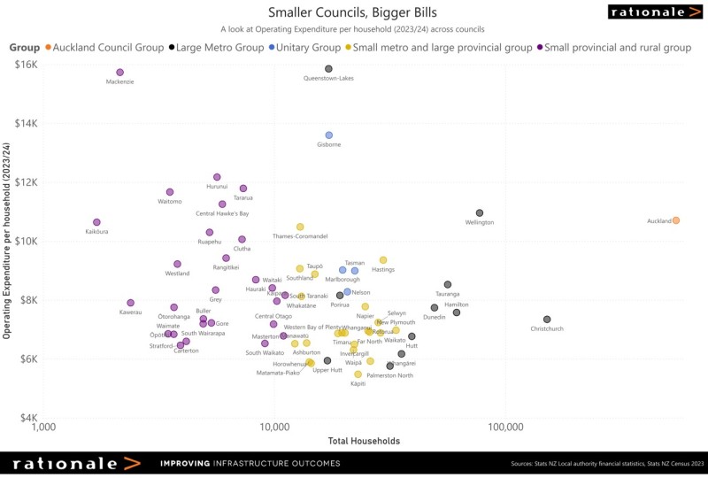 There are some outliers - Queenstown Lakes and Mackenzie clearly show the challenges faced by districts with relatively small numbers of ratepayers that are facing significant population growth, coupled with the increased pressures that come with very high visitor numbers and the impact this has across council functions.